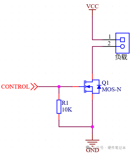 CONTROL为控制信号,电平一般为3~12V。负载一端接电源正极,另一端接NMOS的D(漏极)。