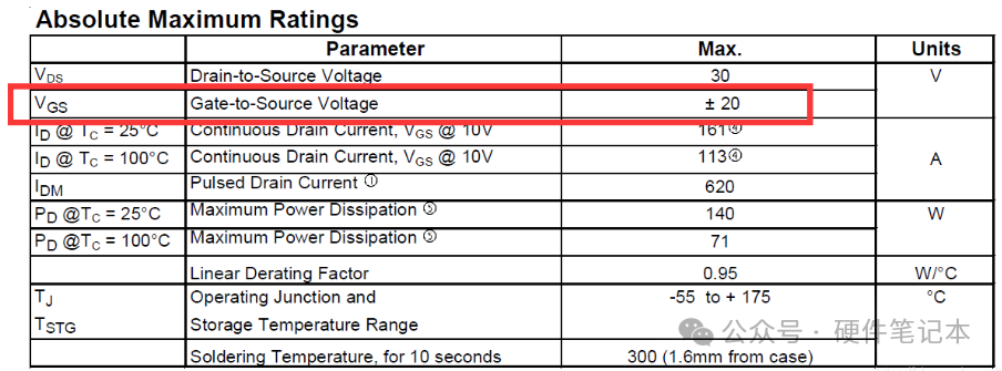 通常来讲,TO-220、TO-251AA、SOP-8、SO-8(DFN3x3 5x5)、TO-252、TO-263 这些封装较大的器件,其额定耐压、额定电流都比较大,Vgs的最大允许范围一般为± 20V。