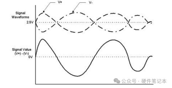 差分信号又称差模信号,与传统使用单根信号线电压表示逻辑的方式有区别,使用差分信号传输时,需要两根信号线,这两个信号线的振幅相等,相位相反,通过两根信号线的电压差值来表示