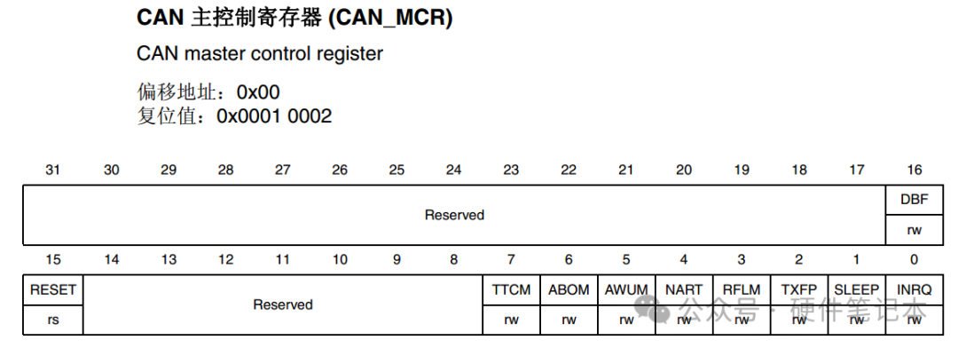 主控制寄存器 CAN_MCR 负责管理 CAN 的工作模式,它使用以下寄存器位实现控制。