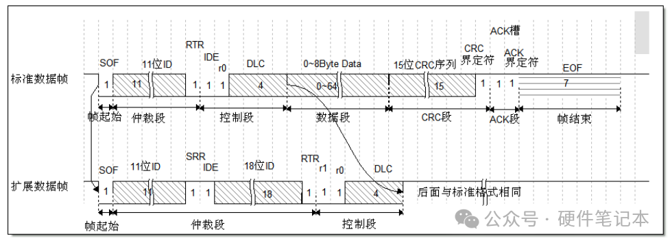数据帧以一个显性位 (逻辑 0) 开始,以 7 个连续的隐性位 (逻辑 1) 结束,在它们之间,分别有仲裁段、控制段、数据段、CRC 段和 ACK 段。