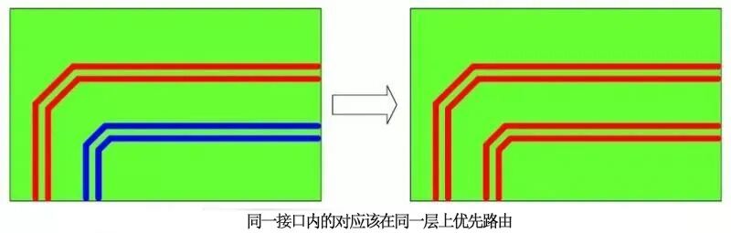 对于如 LVDS 显示器件等接口,会同时存在数对差分对,且差分对之间的时序要求一般都会特别严格,时滞要求特别小,所以,对于此类差分信号对我们要求一般在同一平面内进行补偿。因为不同层的信号传输速度是不同的。