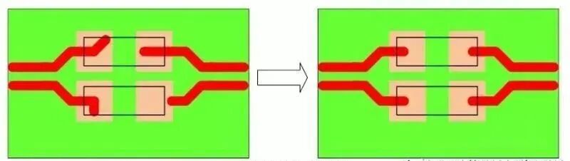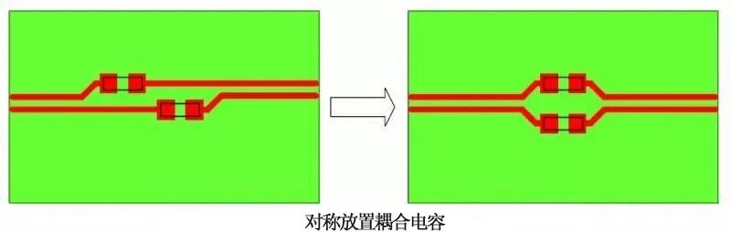 有时候,一些高速差分信号线需要串接耦合电容。该耦合电容同样需要对称布置,同时该耦合电容的封装不能过大,推荐使用 0402,0603 也可以接受,0805 以上的电容或者并排电容最好不要使用。