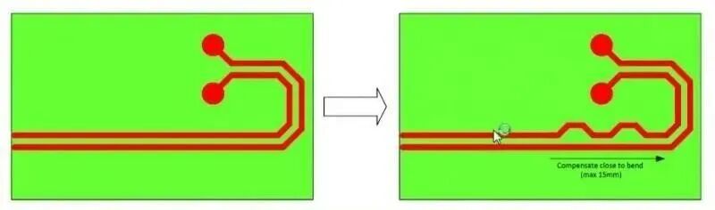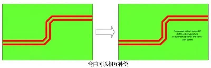 如果有两个走线弯曲,且两者之间的距离<15mm,故此时两者的失长会互相补偿,故此时不用再做等长处理。