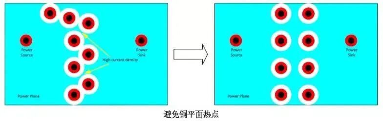 通常最好的避免热点的办法就是网状式的放置过孔,如此电流密度均匀,同时平面不会隔离,回流路径就不会过长,也就不会产生 EMC 的问题。