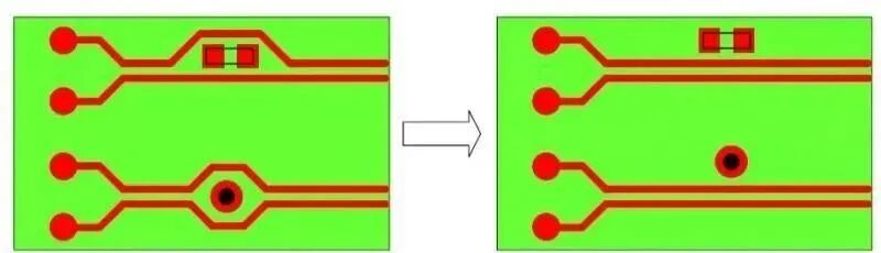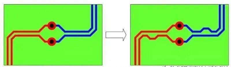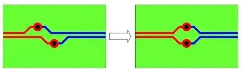 通常,过孔会产生巨大的阻抗不连续,所以对于高速差分信号线对则尽量减少过孔,如果要使用过孔则对称布置。