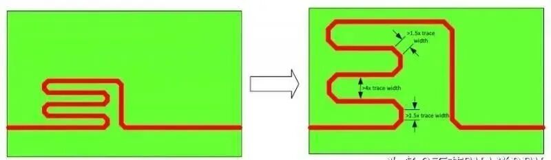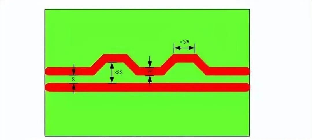 线宽,间距,以及弯曲方式都应该做合理的选择,间距应满足 4W/1.5W 规则的。