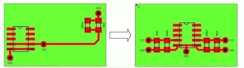 如果电源走线很长,则由于浪涌电流的存在进而会导致高频噪声,而此高频噪声会引入到其他信号中去。