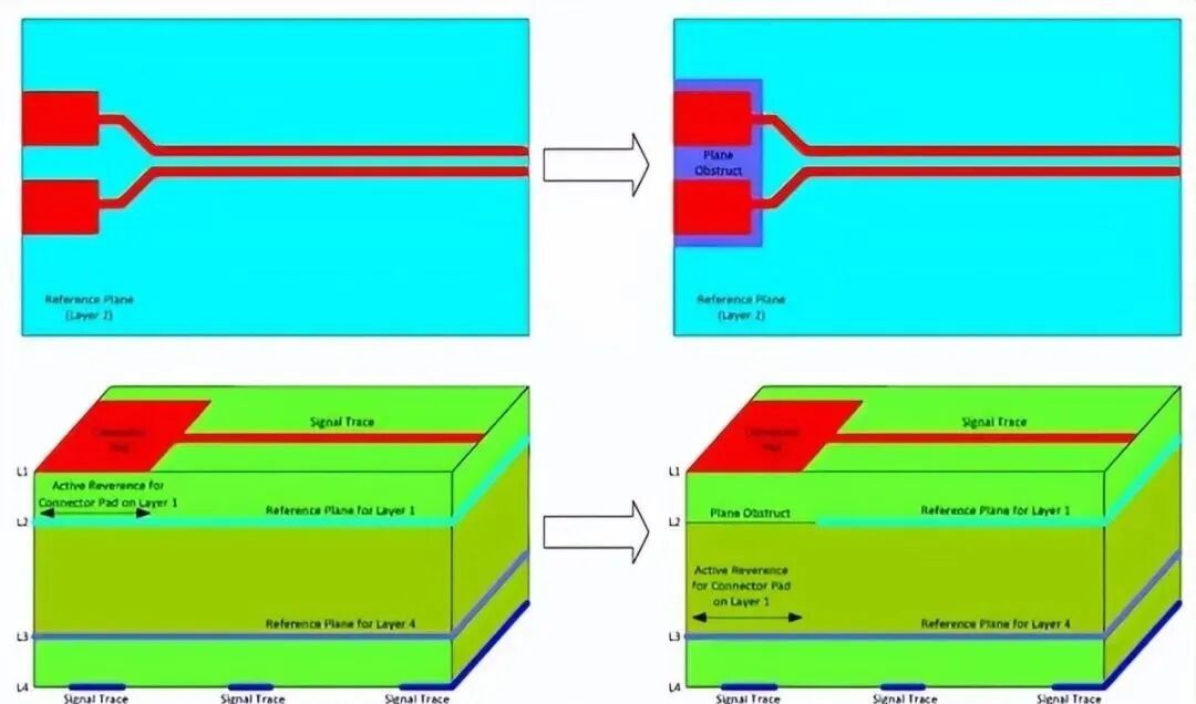 所以一般为了解决这个问题,都是在接口端子或者器件的大焊盘下面放置一个禁布铜皮,同时在另外一层放置该焊盘的参考平面,进而加大阻抗,使阻抗连续。