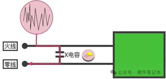 先来看X电容,假如现在火线上出现了高频的干扰信号,此时的流向如图所示