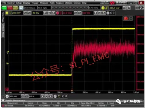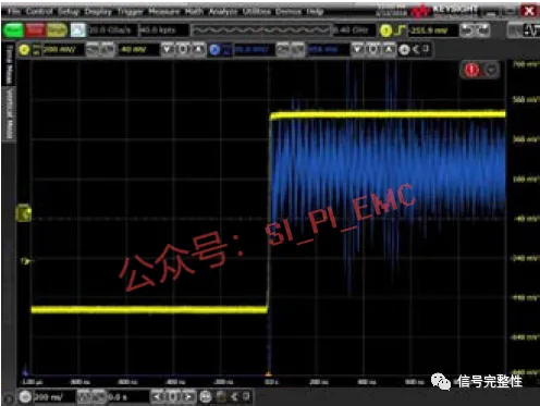 波形2-7-5为无源探头P6139的测试波形,图2-7-6为有源探头P6245的测试波形,从两个波形看出,无源探头加长地线的结果是有比较大的过冲,并有轻微的振荡。另外由于反射波的原因,造成上升沿变陡。因此如果要得到比较准确的波形,最好选用带宽高、输入电容低的有源探头,并使用短地线,如果图方便使用长地线,只会带来更大的误差。