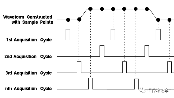 每个周期采样一些点,经过多个周期后将这些点拼起来,就是一个完整的图,不过这要求波形是周期性的,否则误差会比较大。等效采样有两种方式:一种是随机采样,另外一种是顺序采样。