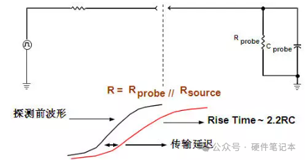 容性负载相当于在被测电路上并联了一个电容,对被测信号有滤波的作用,影响被测信号的上升下降时间,影响传输延迟,影响传输互连通道的带宽。有时,加上探头时,有故障的电路变得正常了,这个电容效应起到了关键的作用。一般推荐使用电容负载尽量小的探头,以减小对被测信号边沿的影响。