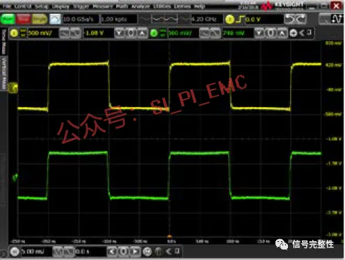 B图是使用500MHz的无源探头的测试结果,显示的信号完全失真;