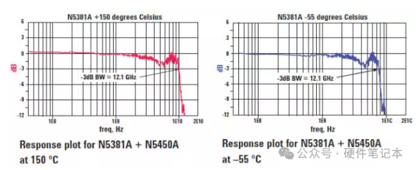 使用N5450A扩展电缆和N5381A探头附件,使用1169A 12GHz探头放大器,在-55°和150°环境下的频响曲线如下图所示,可见能够满足高速信号测试的要求。
