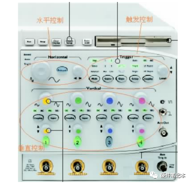 示波器的主要是三个部分,垂直控制、水平控制和触发控制,除此外,很多数字示波器都提供了“软键”(soft key)控制,通过在示波器的屏幕周围排放一些键,对于屏幕里面的菜单,这些键在不同的菜单中对应不同的项目,因此定义不固定,故称之为“软键”。因为有了“软键”,很多功能都可以做了进去,比如波形参数的测试、高级触发方式等。
