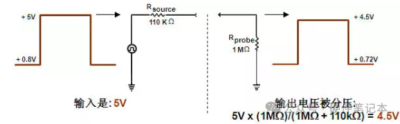 阻性负载相当于在被测电路上并联了一个电阻,对被测信号有分压的作用,影响被测信号的幅度和直流偏置。有时,加上探头时,有故障的电路可能变得正常了。一般推荐探头的电阻R>10倍被测源电阻,以维持小于10%的幅度误差。