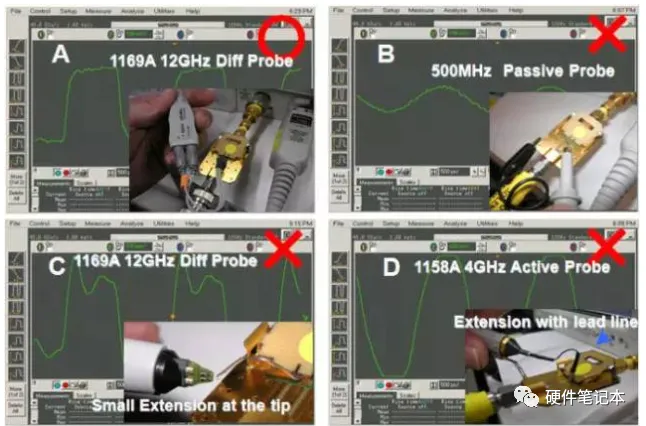 下图是一个例子:被测信号是一个频率456MHz,边沿时间约65ps的时钟信号,分别使用不同类型的探头和探头附件的测试结果。