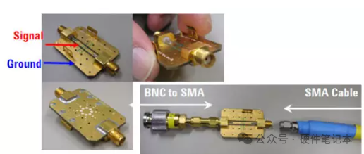 验证探头和探头附件需要使用一台脉冲码型发生器(如:81134A,3.35GHz速率,60ps边沿的脉冲码型发生器),如果示波器自带高速信号输出功能,也可以使用示波器的这个辅助输出口代替脉冲码型发生器(如: Infiniium示波器的AUX OUT端口可以发一个高速时钟:456MHz频率,约65ps边沿)。另外,需要同轴电缆和测试夹具(Infiniium示波器配置的探头校准夹具可以作为探头和探头附件验证测试夹具)。测试夹具的外表是地(Ground),里面走线是信号(Signal),如下图所示。使用时,通过同轴电缆把一端接到脉冲码型发生器或示波器的辅助输出AUX OUT端口,另外一端通过适配器连接到示波器的通道1上。