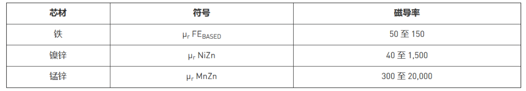 不同磁芯材料的典型磁导率不同。表 3 列出了三种不同芯材的磁导率。