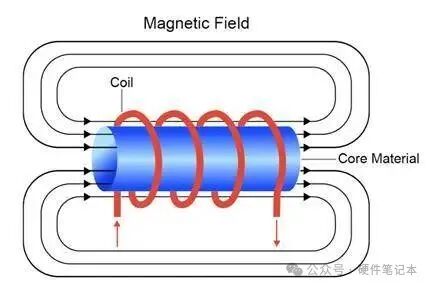 空心线圈的磁导率为常数值(µr air),大约等于 1。图 4 显示了一个带磁芯的电感。当然,有磁芯时,磁场会增强。