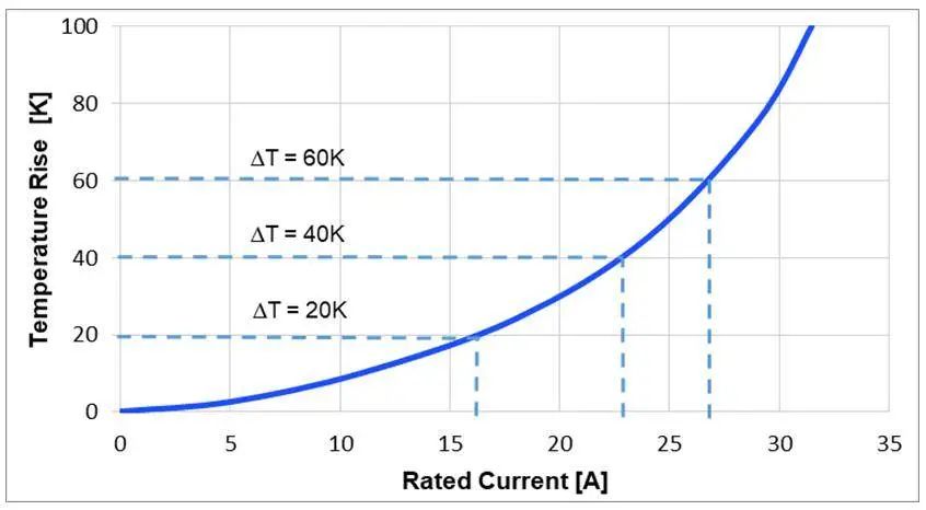 额定电流是指使电感温度升高规定的量所需的直流电流。温升 (ΔT) 不是一个标准值,但通常在 20K 至 40K 之间。额定电流在环境温度下测量得到。其值通常在电感数据手册中提供,是最终应用的预期电流值。对于环境温度较高的应用,设计人员应选择自热温度较高的电感。图 6 体现了温升与额定电流之间的关系。该曲线可用于确定任意温升对应的电流值。