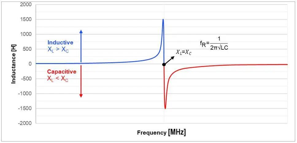电感在谐振频率 (fR)之前具有电感特性(如图 9 中的蓝色曲线所示),因为频率增加,阻抗增高。在谐振频率下,负容抗 (XC) 等于正感抗 (XL) ,其值可通过公式 (3) 估算: