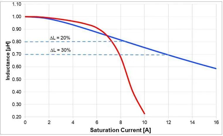 给定额定电流是估计电感温升的最佳方法。温升还受电路设计、PCB 布局、与其他组件的接近程度以及走线尺寸和厚度的影响。电感芯体和绕组中产生的过量交流损耗也可能导致额外的热量。饱和电流额定值是指,在标称电感下降规定的百分比之前,电感可以支持的直流电流。每个电感的参考百分比电感下降值都是唯一的。通常,制造商将该值设置在 20% 到 35% 之间,这会使电感的比较变得很困难。但数据手册通常会提供一条曲线,显示电感如何随直流电流变化。利用这条曲线可以衡量整个电感范围,以及它如何响应直流电流。直流饱和电流取决于温度和电感磁性材料及其磁芯结构。不同的结构和磁芯都会影响ISAT值。铁氧体磁芯是最常见的,其特点是具有硬饱和曲线(见图 7)。确保电感不会在感量下降点之外工作至关重要;因为超过该点,感量会急剧下降,功能性也会降低。合成塑封电感在温度变化时感量下降稳定,具有软饱和特性。由于其感量逐渐下降,因此可以为设计人员提供了更大的灵活性和更宽的工作范围。图 7 显示了两条饱和曲线。蓝色曲线为典型的合成塑封电感软饱和示例;红色曲线为典型的 NiZn/MnZn 鼓芯电感硬饱和示例。