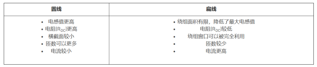 电感将感应的电能存储为磁能的能力通过电感值来体现。在开关输入电压驱动电感的同时,电感要为输出负载提供恒定的直流电流。表 4 显示了电流和电感电压之间的关系。可以看出,电感两端的电压与电流随时间的变化成正比。首先,确定设计需要的电感范围。要注意,电感值在整个工作条件下并不是恒定的, 它会随着频率的增加而变化。因此,对具有更高开关频率的应用,需要特殊考量。电感制造商通常在 100kHz 至 500kHz 的频率下测试电感,因为大多数 DC/DC 变换器都在此范围内工作。电感的电流电阻会导致散热,从而影响效率。总铜损中包含了 RDC 损耗和RAC损耗。RDC与频率无关,始终恒定;RAC 则取决于频率。表 5 显示计算RDC 的方法。降低铜损的唯一方法是增大导线面积,即改用较粗的导线,或使用扁线。采用扁线可以使绕组窗口被完全利用,从而带来较低的 RDC。表 6 所示为圆线与扁线的横截面积比较。使用公式 (1) 可以估算电感的直流铜损 (RDC):