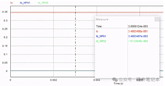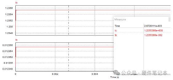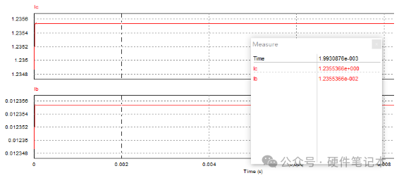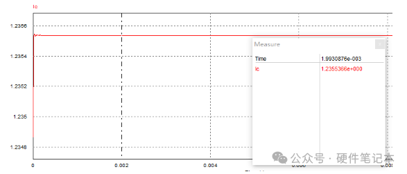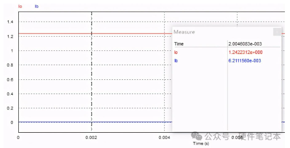 而根据上式计算结果输出电流应该是I = 2.495V / 2Ω = 1.2475A。但实际计算结果却小于该值,这是为什么呢?分析一下可知,流过电阻Rref的电流除了三极管的集电极电流Ic还有基极电流Ib。测量一下Ib,结果如下。