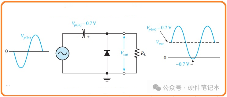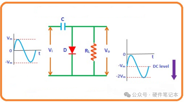 由于这个电流电容被充电到输入波形的峰值V m 。电容的充电极性与二极管两端的信号极性相反。在达到极值点 -V m后,电容器保持存储的电荷,直到该点二极管处于正向偏置状态。