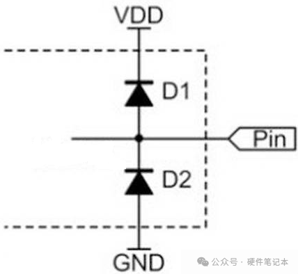 如果从 Pin 输入的信号(假设任何输入信号都有一定的内阻)电压超过 VDD 加上上二极管的导通压降(驱动 0.7V),二极管就会导通,多余的电流会被拉到 VDD ,并且输入到内部的真实信号电压不会超过VDD+0.7V。