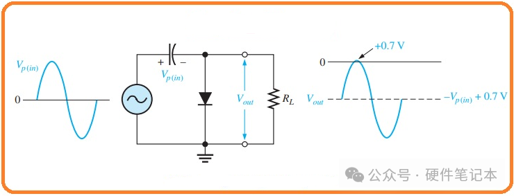 如果改变二极管的位置,那么负直流电压会与输入信号相加,以产生类似于下图所示的输出,这种类型的电路布置称为负钳位。