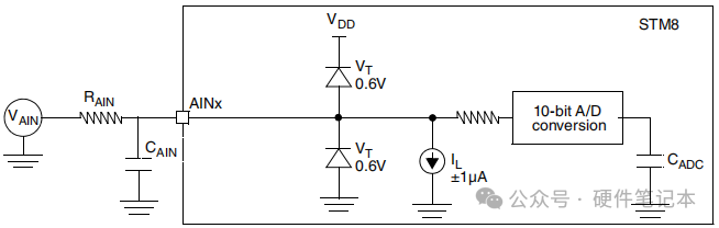 GPIO的电路配置:GPIO的参考电源VDD由钳位二极管D1的阴极上拉,钳位二极管D2的阳极接GND。