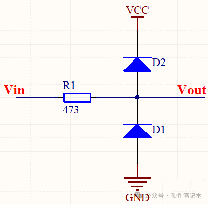 此电路是二极管的钳位保护电路,使Vin电压被钳位在VCC与GND之间;具体的工作原理: