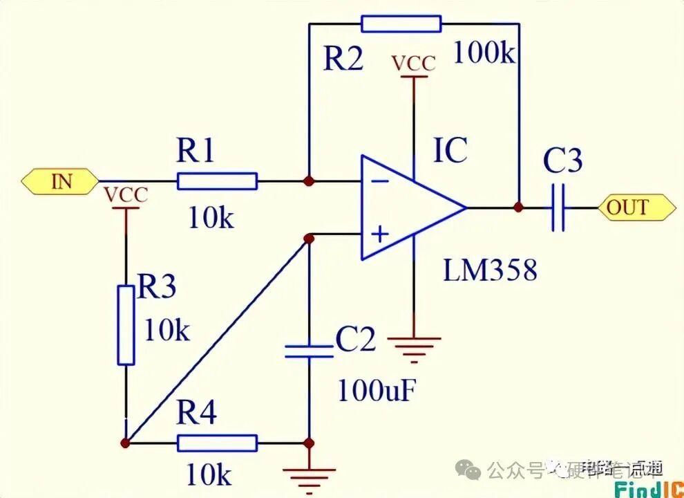 单电源供电反相交流放大电路以LM358为例,电路图如下所示: