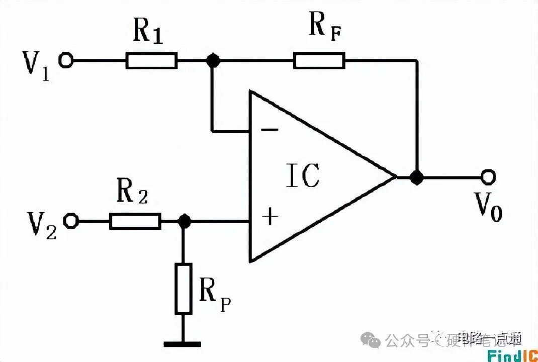 其输出电压为Vo= -(Rf/ R1)*V1+(1+ Rf/ R1)*(1+ R3/ (R2+ R3))*V2