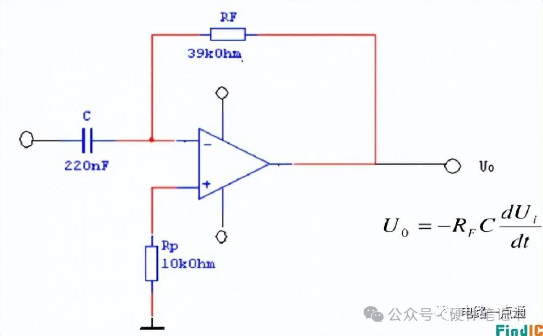 将积分电路RC互换位置,便得到微分电路。能将矩形波变为正负尖脉冲,能将输出信号超前移相90度。电路图如下所示: