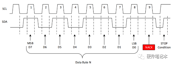 主机接收从机数据时,主机产生非应答信号,通知从机数据传输结束,不要再发数据了;