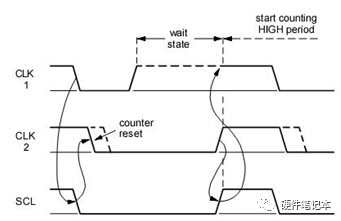 I2C总线上的仲裁分两部分:SCL线的同步和SDA线的仲裁。