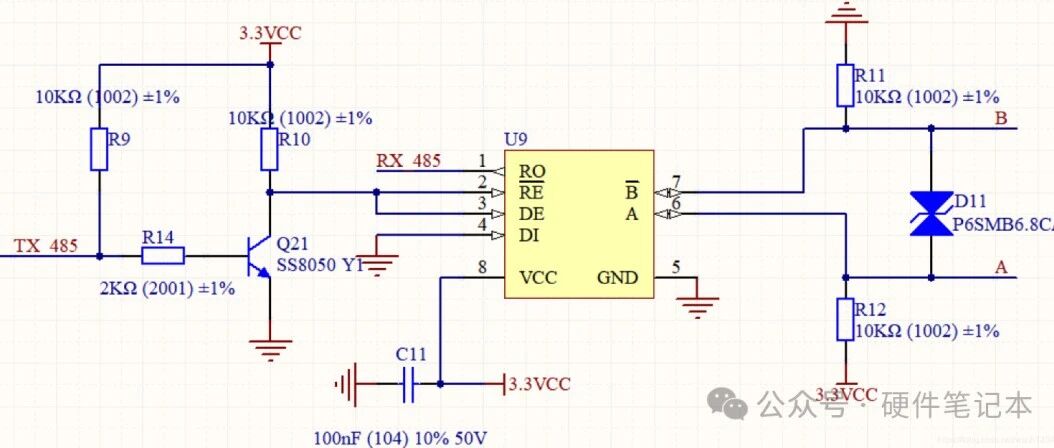 RS485芯片用的最多的就是SP485这类的。功能框图引脚介绍当RE#为低时,接收数据;当RE#为高时,禁止接收; 当DE为高时,发送数据;当DE为低时,禁止发送。RO为接收输出端,DI为发送输入端。网上推荐较多的自动收发电路电路它把输入端DI接到地上,TX用三极管控制反向控制接在一起的RE#和DE,很多人表示看不懂,这真的能正常工作吗?咱们一起来分析一下:原理分析: 1、当TX_485为低电平0时,DE和RE为高电平1,RS-485处于发送状态,由于DI引脚是接地的,所以AB处于低电平0,即向其它节点发送低电平0信号; 即输入为0时,输出也为0; 2、当TX_485为高电平1时,DE和RE变为低电平,RS-48收发器处于接收状态,此时AB引脚处于高阻状态,R11将B引脚拉至GND,R12将A引脚拉至3.3VCC,此时AB为高电平1,即向其它节点发送高电平1信号。 即输入为1时,输出也为1。 所以它是能正常工作的。 由于TX_485为高电平1时,RS-485处于接收状态,因此只需将TX_485保持为高电平1即可接收数据,即自动收发电路:发送高电平时同时也是接收状态。 那么大家想想这个电路有什么缺点呢?声明: 声明:本号对所有原创、转载文章的陈述与观点均保持中立,推送文章仅供读者学习和交流。文章、图片等版权归原作者享有,如有侵权,联系删除。 来源:硬件笔记本