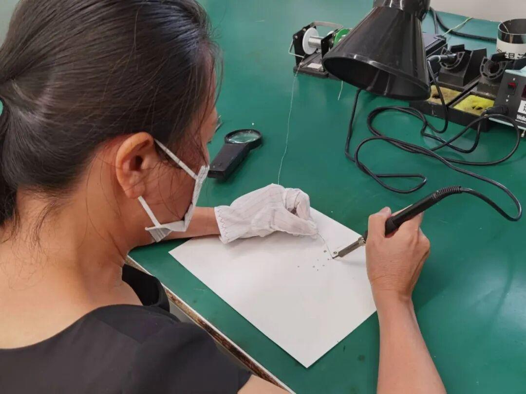 以“稳”举例来说,她每天都要抽空进行抓握电烙铁灵活运用的练习:把握烙铁头的嘴角刚好离操作台上一张白纸的上方3毫米处熔锡丝,不能再低一毫米,一旦低了,雪白的A4纸就会立即被高温焊头烤焦变色,也不能再高,再高就起不到练习的效果,保持这个高度和姿势十分钟,做到手不发抖,纸上不留发黄的痕迹。要知道,常人站立状态把两臂伸直,手里啥也不拿,保持水平姿势纹丝不动,很多人几分钟后就会感觉双臂酸痛就垂了下来。这样通过不断地练习,电烙铁已成为她身体细胞的一部分。