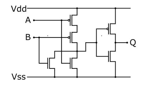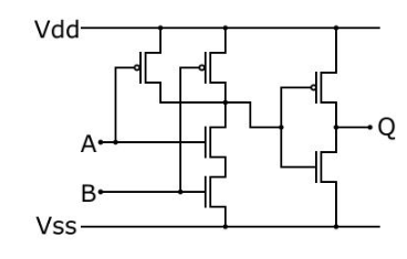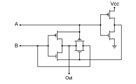 下面是由MOS管组成的电路图。A和B作为输入,Q作为输出。