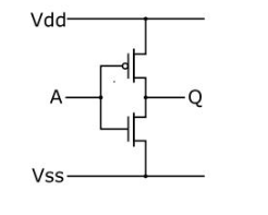 面是由MOS管组成的电路图。非门只有一个输入A,Q作为输出。