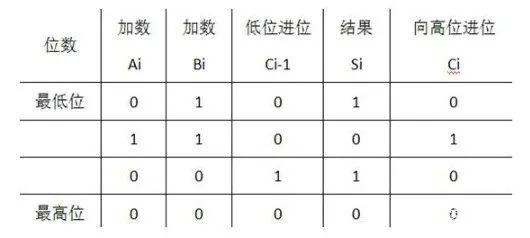 如果我们将4个加法器连接到一起就可以计算4位二进制,比如计算2+3,那么4位二进制就是0010+0011,下表就是利用加法器计算的值。和普通加法一样,从低位开始计算。加数A代表0010,B代表0011。