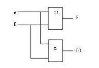 半加器由与门和异或门电路组成,“=1”所在方框是异或门电路符号,“&”所在方框是与门电路符号。这里面A和B作为输入端,因为没有考虑低位来的进位,所以输入端A和B分别代表两个加数。输出端是S和C0,S是结果,C0是进位。