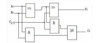 然后我们利用这些,再组成全加器。下面是一个全加器电路图,同样只支持1bit计算。Ai和Bi是两个加数,Ci-1是低位进位数,Si是结果,Ci是高位进位数。