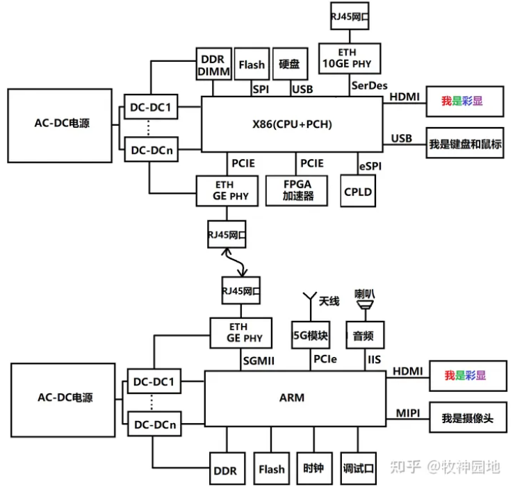 7. 终于安稳了,PCB已经全部画好准备投板,领导过来叫我去趟会议室,我以为这么快就来奖励了吗?想想心里就激动;一进会议室,领导说:小王 ,你这段时间辛苦了。我心里窃喜。领导接着说:这个项目啊,客户觉得功能还不够,需要对声音和图像信息进行采集、处理和智能识别,然后上报服务器端,同时通过显示器进行反馈。这个项目对我们公司非常重要,硬件方案还得辛苦你一下。内心万马奔腾。咋整?要请出X86了嘛?(如下为随手画的图,不代表真实实现)