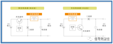 由于电源电路的功率电感器中会流过大电流,因此绕组型为主流产品。这是因为,通过将高导磁率的磁性体(铁氧体或软磁性金属)用于磁芯中,以较少巻数实现高电感值,从而可使产品更为小型化。图3所示为使用功率电感器的DC-DC转换器(非绝缘型及斩波方式)基本电路。