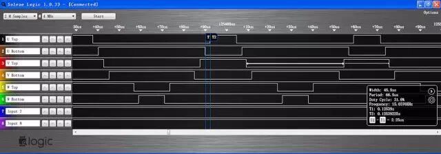 2. 选择需要采样的信号,这里就是单片机6路PWM波形的输出引脚,将其接入逻辑分析仪的通道1(Input 1)至通道6(Input 6),并且把通道的名字改为Utop、Ubottom、Vtop、Vbottom、Wtop、WBottom,分别代表三路输出的上下桥臂。